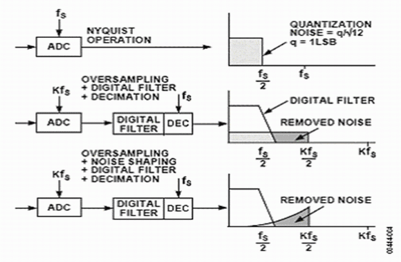 圖4.過取樣、數(shù)字濾波、噪聲整形和采樣抽取對噪聲頻譜的影響