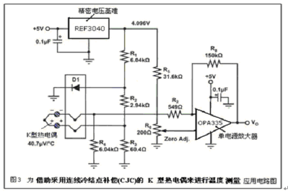 圖4為該應用電路圖。該熱電偶測量電路采用自動置零、單電源放大器opa335。精密電壓基準ref3040提供4.096v的橋式電源。二極管d1的正向電壓具有-2mv/℃的負溫度系數(shù),并通過電阻器網(wǎng)絡r1-r3來提供冷結(jié)點補償。