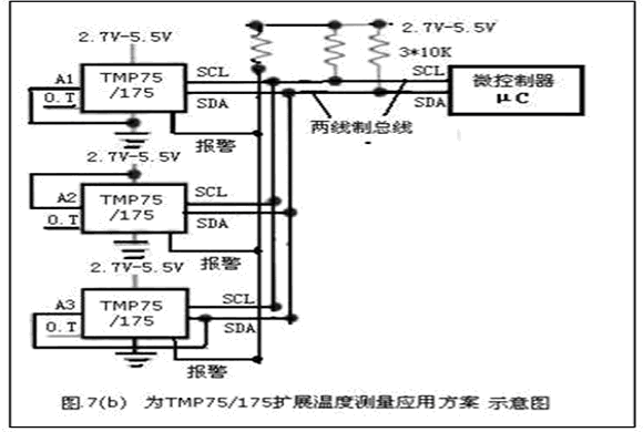 tmp75 和tmpl75是二線式、串行輸出溫度傳感器,其內(nèi)部組成框圖見圖7(a)所示。這些器件無需使用外部元件,并能夠以0.0625℃的分辨率來顯示溫度讀數(shù)。二線式接口與smbus兼容,從而允許tmpl75在一根總線上連接多達27部設備(而tmp75則最多可在一根總線上連接8部設備)。這兩款器件均具有smbus報警功能,是工業(yè)環(huán)境中常見的擴展溫度測量應用(見圖7(b)所示)的理想選擇。