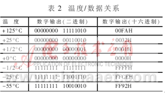 在實(shí)際應(yīng)用中,測(cè)量溫度往往在0°C以上,此時(shí)可只取16位二進(jìn)制溫度輸出的低8位,即1個(gè)字節(jié),這樣將使計(jì)算和編程工作更為便利。