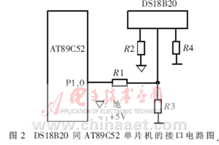 DS18B20的測(cè)溫原理為:內(nèi)部計(jì)數(shù)器對(duì)一個(gè)受溫度影響的振蕩器的脈沖計(jì)數(shù),低溫時(shí)振蕩器的脈沖可以通過門電路,而當(dāng)?shù)竭_(dá)某一設(shè)置高溫時(shí),振蕩器的脈沖無(wú)法通過門電路。計(jì)數(shù)器設(shè)置為-55℃時(shí)的值,如果計(jì)數(shù)器到達(dá)0之前門電路未關(guān)閉,則溫度寄存器的值將增加,這表示當(dāng)前溫度高于-55℃。同時(shí),計(jì)數(shù)器復(fù)位在當(dāng)前溫度值上,電路對(duì)振蕩器的溫度系數(shù)進(jìn)行補(bǔ)償,計(jì)數(shù)器重新開始計(jì)數(shù)直到回零。如果門電路仍然未關(guān)閉,則重復(fù)以上過程。溫度轉(zhuǎn)換所需時(shí)間不超過750ms,得到的溫度值的位數(shù)因分辨率不同而不同[2]。DS18B20同AT89C52單片機(jī)的接口電路如圖2所示。這種接口方式只需占用單片機(jī)一根口線,與智能儀器或智能測(cè)控系統(tǒng)中的其它單片機(jī)或DSP的接口也可采用類似的方式。