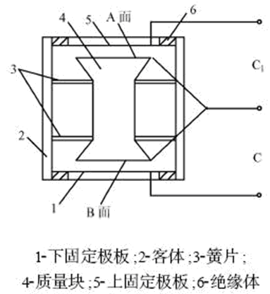 電容式加速度傳感器的原理結構如圖1所示,由圖可見,它實際上是變極距差動電容式位移傳感器,配接“m-k-c”系統(tǒng)構成的。質量塊4由兩根彈簧片3支撐于殼體2內(nèi),質量塊4的A面與上固定極板5組成的電容C1,以及質量塊4的B面與下固定極板1組成的電容C2。