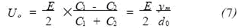 對于氣隙型電容傳感器,其電容值為C=εS/d ,電容式加速度傳感器的兩個電容,一個增加,一個減小。因此電容總變化量為: