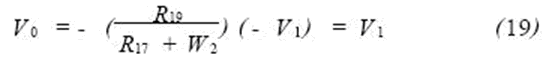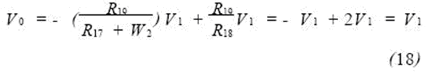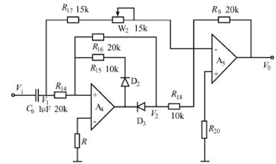 當輸入電壓Vi 為正半周期時,經(jīng)耦合電容C6的電壓V1(即Vi =V1)輸入給A4反相,D2截至,D3導通,A4的電壓放大倍數(shù)為R16/R14=-1,即V1=-V2;調整W2,R17=R19=20kΩ ,經(jīng)R17和W2送來的A5的輸入信號為V1,另一路經(jīng)A5的輸入信號為V2,則輸出信號為: