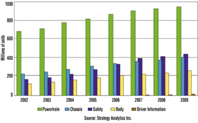 在汽車用MEMS的經(jīng)銷商中Bosch是第一名,其2007年的銷售額為四億三千萬美金,其次是STMicroelectronics (三億二千萬美金),F(xiàn)reescale Semiconductor (二億三千五百萬美金),Analog Devices (二億一千萬美金),Denso (一億七千六百萬美金),Infineon (由其分公司Sensonor帶來的一億三千萬美金的年收入),Delphi(一億一千六百萬美金)和Continental AG(五千六百萬美金)。