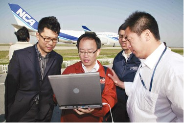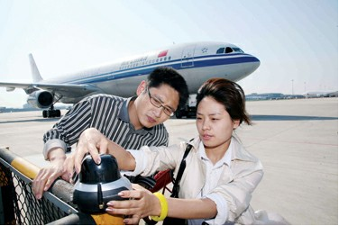 圖4:在浦東機(jī)場(chǎng)測(cè)試3G信號(hào),電信工作人員仔細(xì)核對(duì)