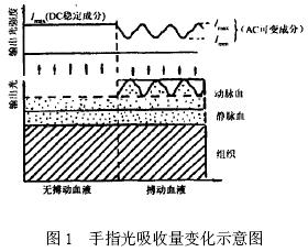 光電脈搏傳感器的研制和噪聲分析手指組織可以分成皮膚、肌肉、骨骼等非血液組織和血液組織, 其中非血液組織的光吸收量是恒定的, 而在血液中, 靜脈血的搏動相對于動脈血是十分微弱的, 可以忽略, 因此可以認為光透過手指后的變化僅由動脈血的充盈而引起的, 那么在恒定波長的光源的照射下, 通過檢測透過手指的光強將可以間接測量到人體的脈搏信號。