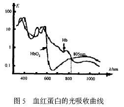 脈搏信號主要由動脈血的充盈引起, 而血液中還原血紅蛋白( Hb) 和氧合血紅蛋白( HbO2 ) 含量變化將造成透光率的變化, 當(dāng)氧合血紅蛋白和還原血紅蛋白對光的吸收量相等時, 透射光的強度將主要由動脈血管的收縮和舒張引起, 此時能夠比較準(zhǔn)確地反映出脈搏信號。圖5 為血紅蛋白的光吸收曲線, 從圖中可以看出, 血液中HbO2 和Hb 對于不同波長光的吸收系數(shù)的差異明顯, 而且2 條曲線好幾個不同的交點, 考慮到在805 nm 波長處, 血紅蛋白的光吸收率比較低, 那么透射過手指的光強較大, 有利于光敏器件的接收, 因此發(fā)射光源的波長選擇為805 nm。