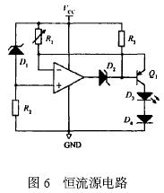 圖6 為恒流源電路, 在電路中R1 兩端的電壓值恒等于穩(wěn)壓二極管D1 的穩(wěn)壓值,因此流經(jīng)R1 的電流值恒定,控制使三極管Q1 處于放大狀態(tài), 那么流過發(fā)光二極管D3 的電流值恒定,因此發(fā)光二極管D3 能輸出穩(wěn)定光強的光。[page]