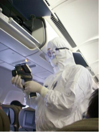 2009年4月29日晨5點(diǎn)58分,甲型H1N1流感擴(kuò)散以來(lái)首架抵達(dá)中國(guó)的墨西哥航班AM098航班降落于浦東機(jī)場(chǎng)。旅客下機(jī)之前,檢驗(yàn)檢疫人員身穿防護(hù)服,手持德圖精密型紅外測(cè)溫儀testo845,登機(jī)對(duì)所有乘客進(jìn)行體溫檢測(cè)。