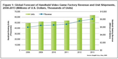 掌上型游戲控制臺的出貨量預(yù)計將從2008年的4940萬臺上升到2013年的6350萬臺,預(yù)測期間的復(fù)合年增長率為5.2% (CAGR)。估計營收將以6.4%的CAGR增長,從2008年的59億美元上升至2013年的81億美元。