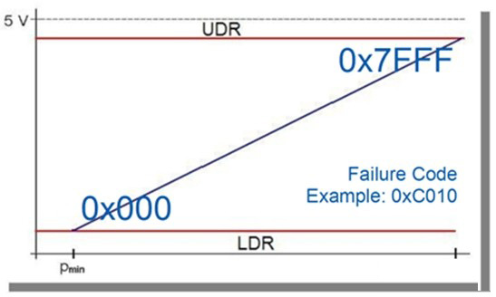 模擬輸出只允許進行信號范圍內(nèi)(如10-90%)的傳感器信號傳輸,并通過開關(guān)將低診斷范圍(LDR)和高診斷范圍(UDR)轉(zhuǎn)換為故障狀態(tài)。因此,其無法傳送更詳細的故障信息。