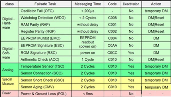 ZMD31150中的臨時DM是一個可選項,在錯誤持續(xù)出現(xiàn)時提供可靠的錯誤信息。利用附加信息(如冗余傳感器或進行大量檢查),ECU將決定當前應(yīng)用能否繼續(xù)可靠工作,或者根據(jù)錯誤消息必須關(guān)斷。