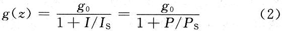 式中:g0是由泵浦強(qiáng)度定的小信號增益系數(shù),由于增益飽和現(xiàn)象,隨著信號功率的增加,增益系數(shù)下降;Is,Ps分別為飽和光強(qiáng)和飽和光功率,是表明增益物質(zhì)特性的量,與摻雜系數(shù)、熒光時間和躍遷截面有關(guān)。