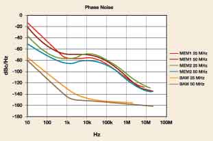 相位噪聲圖很好地展示了這些采用了不同技術(shù)的器件的設(shè)計與特性。鄰近區(qū)相位噪聲水平(<1kHz)主要取決于Q值或諧振器的選擇,石英BAW諧振器的選擇性遠高于其他MEMS器件。