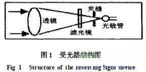 光電傳感器以光為媒介進(jìn)行無(wú)接觸檢測(cè)。光是一種頻率很高的電磁波[1]。光干擾也算是一種電磁干擾,光干擾是傳感器誤動(dòng)作的主要因素之一。環(huán)境光、背景光和周?chē)渌怆妭鞲衅靼l(fā)出的光是光干擾源。以紅外線(xiàn)為媒介進(jìn)行檢測(cè)則可減小可見(jiàn)光的影響,紅外光也不影響可見(jiàn)光。紅外線(xiàn)光電傳感器可用濾光鏡濾去可見(jiàn)光。對(duì)于周?chē)h(huán)境其它光電傳感器的光干擾,可用外殼、套筒、夾縫來(lái)抑制[2]。圖1是一種受光器結(jié)構(gòu)圖。