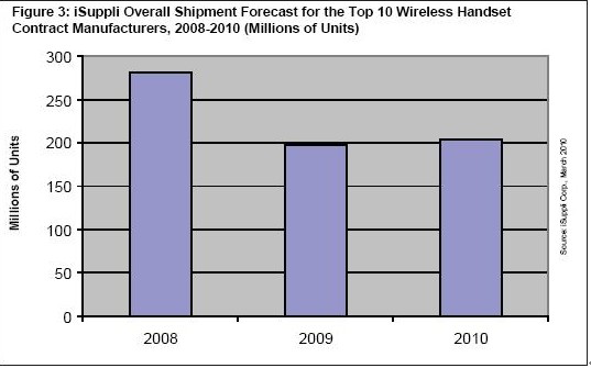 但是,在習慣了兩位數(shù)增長的這個產業(yè)看來,這么微弱的增長根本不值得高興。據(jù)iSuppli公司,2010年預期相對平坦的增長,與去年出貨量從2008年的2.809億部重挫30%相比,非常平淡。