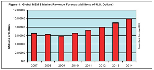 iSuppli公司,手機和消費電子產(chǎn)業(yè)對于感測器和激勵器的需求,將幫助全球MEMS市場在2010年強力回升,結(jié)束之前兩年的下滑局面。