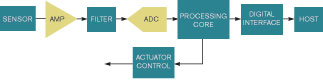 傳感器的模擬信號必須經(jīng)過數(shù)字化才能供系統(tǒng)使用,并且信號要經(jīng)過放大、濾波和數(shù)字化(圖1)。每一級通常都涉及一只圍繞著一些無源元件的器件,以正確地實(shí)現(xiàn)一個應(yīng)用。一旦對信號做了數(shù)字化,就可以將其送給微處理器上的控制系統(tǒng),或整理數(shù)據(jù)后通過一個通信協(xié)議送至一只主處理器。協(xié)議可以根據(jù)需要使用傳感器數(shù)據(jù)。