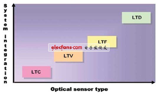 在硅基IC探測器領(lǐng)域,為特定的應(yīng)用選擇最適合的探測器需要考慮諸多因素。這些因素包括光轉(zhuǎn)換的類型、轉(zhuǎn)換速率以及光譜響應(yīng)。集成的光傳感器可以將光轉(zhuǎn)換成不同種類的輸出,包括將光轉(zhuǎn)換成電流(LTC),電壓(LTV),頻率(LTF)以及數(shù)字信號(LTD)。它們對光做出響應(yīng)并以快慢不等的相應(yīng)速度輸出,速度(響應(yīng)時間)從幾毫秒到幾納秒不等。硅基探測器的光譜響分布于電磁頻譜近紫外(300nm)到近紅外(1100nm)這一范圍內(nèi),包含了可見光(400~700nm)。應(yīng)當注意的是,在這一范圍內(nèi),光譜響應(yīng)并不一致。雖然上述3項標準并不是選擇光傳感器時需要考慮的唯一因素,但它們極大地縮小了選擇范圍,這樣可以對相似的器件類型使用最后的標準(比如成本和封裝)進行選擇。