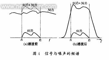 濾波電路的作用主要是對輸入信號(hào)進(jìn)行處理,通常是希望濾出噪聲。濾波器種類很多,從大的方向可分為經(jīng)典濾波器與現(xiàn)代濾波器兩大類。經(jīng)典濾波器可濾出與有用信號(hào)占用不同頻帶的噪聲,但對有用信號(hào)與噪聲的頻譜相互重疊的情況卻無能為力。圖4所示是信號(hào)與噪聲的頻譜,圖4中,S(f)為有用信號(hào),頻帶為f1~f2,N(f)為噪聲,經(jīng)濾波后只能濾出f1~f2以外的噪聲,噪聲與信號(hào)重疊部分無法濾出。