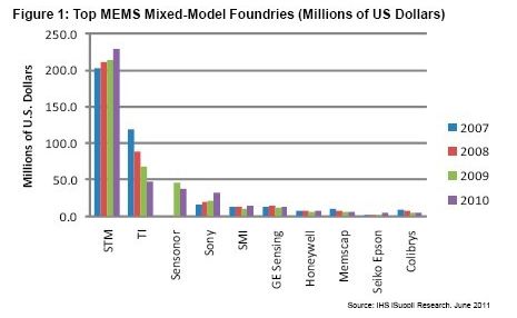 據(jù)IHS iSuppli研究,意法半導(dǎo)體(STM)在2010年仍然是最大的MEMS傳感器生產(chǎn)商,營業(yè)收入幾乎是排名第二的德州儀器的五倍。