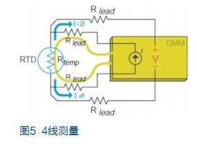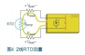 與熱敏電阻相似,鉑電阻溫度傳感器(RTD)也是用鉑制成的熱敏感電阻。當(dāng)通過測量電壓計算RTD 溫度時,數(shù)字萬用表用已知電流源測量該電流源所產(chǎn)生的電壓。這一電壓為兩條引線(Vlead)上的壓降加RTD上的電壓(Vtemp)。例如,常用RTD 的電阻為100Ω,每1℃僅產(chǎn)生0.385Ω的電阻變化。如果每條引線有10Ω電阻,就將造成26℃的測量誤差,這是不可接受的。所以應(yīng)對RTD作4線歐姆測量。