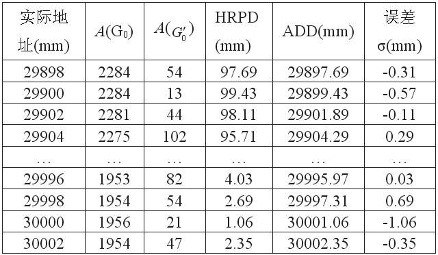 實驗方法:在編碼電纜任找一處反復(fù)移動天線箱,直至檢測到A(G''0)為最小,此時顯示地址為29.000m,以此處作為實際的29.000m。然后將天線箱在此附近每隔2mm移動一次,記錄每次所檢測的A(G0)和A(G''0),并根據(jù)檢測的數(shù)據(jù)計算出位置數(shù)據(jù):HRPD、ADD。同理,在30.000m處作同樣測試。部分檢測數(shù)據(jù)和計算結(jié)果如表1所示.