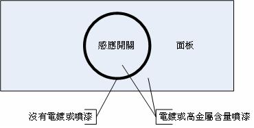 e.如果必須電鍍或高金屬含量漆,請(qǐng)?jiān)诎存I區(qū)域的邊緣保留一圈不要電鍍或噴漆,用以隔絕其他感應(yīng)開關(guān)。