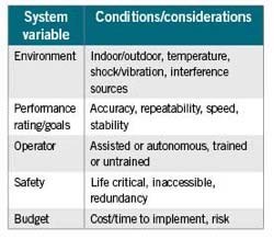 MEMS慣性傳感器可靠度高(汽車行業(yè)20年的應(yīng)用歷史證明了這一點),它在手機(jī)和視頻游戲中的成功應(yīng)用說明它在商業(yè)上極具吸引力。然而,不同應(yīng)用對性能的要求大不相同,適合游戲的器件并不能解決本文所述的高性能導(dǎo)航問題。對于導(dǎo)航,重要的MEMS性能指標(biāo)是偏置漂移、振動影響、靈敏度和噪聲。精密工業(yè)和醫(yī)療導(dǎo)航所需的性能水平通常比消費(fèi)電子設(shè)備所用MEMS傳感器的性能水平高出一個數(shù)量級。表3列出了有助于傳感器選型的一般系統(tǒng)考慮。