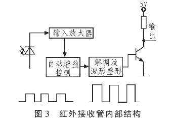 紅外線接收管內(nèi)部電路如圖3所示,紅外線接收二極管內(nèi)部電路將導通后微弱脈沖信號放大、濾波整形,輸出單片機可以識別的方波脈沖信號。該類型紅外線接收管導通波長范圍約為850~1 050 nm,紅外線發(fā)射管發(fā)射波長約為875 nm,能夠滿足紅外線接收管導通要求。