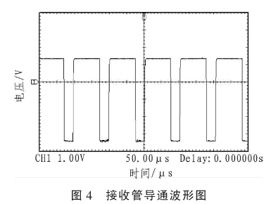 紅外線接收管選用HS0038型的紅外一體接收頭,該器件集成度高,能夠以小成本實現(xiàn)圖3所示功能。紅外線接收管需要接收38 kHz左右?guī)挼拿}沖波形,接收發(fā)射管只能接收間歇發(fā)射的紅外線,發(fā)射紅外線過于密集,接收管無法導通,需要予以注意。紅外線發(fā)射管發(fā)出38 kHz載波,將紅外線接收管導通。該波形頻率為1 kHz,周期內(nèi)高電平時間720μs,低電平時間280μs。當有物體遮擋紅外線對射管時,發(fā)射源被遮擋,紅外線接收管無法導通,輸出高電平。由此可以判斷是否有物體從紅外線對射管中間通過。紅外線接收管導通時的輸出波形如圖4所示。