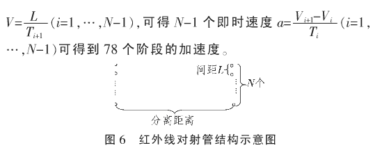 紅外線對射管構(gòu)成一對紅外傳感器收發(fā)子單元。若干對紅外傳感器收發(fā)子單元構(gòu)成完整的紅外線測速傳感器,其紅外線對射管分離距離和紅外傳感器收發(fā)子單元間距可以調(diào)整。如圖6所示,Ⅳ需要大于2,分離距離超過5 m。在兩對紅外線對射管之間測量物體經(jīng)過的時間T,間距設(shè)置為L,可以得到后一對紅外線對射管的即時速度V: