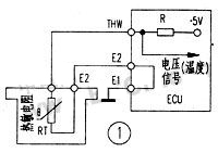 安裝好冷卻液溫度傳感器,將傳感器的連接器插好。當(dāng)點(diǎn)火開(kāi)關(guān)置于 ON 位置時(shí),測(cè)量圖 1 中連接器“ THW ”端子 ( 豐田車 ) 或 ECU 連接器“ THW ”端子與 E2 間輸出電壓。所測(cè)得的電壓應(yīng)與冷卻液溫度成反比變化。
