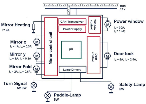 圖5是車門模塊的一個(gè)例子,其中用半導(dǎo)體器件驅(qū)動(dòng)升窗電機(jī),用分立的標(biāo)準(zhǔn)器件驅(qū)動(dòng)其它小型負(fù)載。