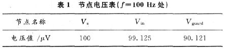 對(duì)圖2所示的電路,用PSpice仿真軟件對(duì)電路進(jìn)行模擬分析,交流掃描的結(jié)果如下,各關(guān)鍵節(jié)點(diǎn)電壓如表1所示,電阻R1的低阻抗端加上了90.121μV的保護(hù)電壓,流經(jīng)電阻R1的分流電流為90.031 fA。