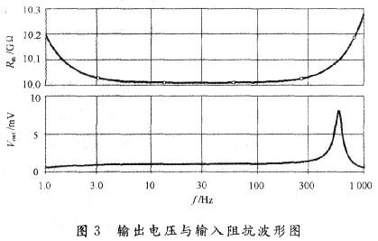 如圖3所示,圖中上半部分為系統(tǒng)輸出信號(hào)波形,下半部分為系統(tǒng)輸入阻抗波形,從圖中可以看出,在頻率為100 Hz處,測(cè)量系統(tǒng)的輸出電壓值Vout為10.011 mV,交流輸入阻抗Rin為1.132 8 GΩ。經(jīng)計(jì)算,系統(tǒng)的放大倍數(shù)A為100.998倍。
