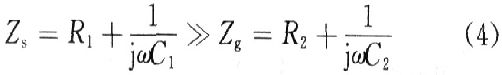 式中:Zs表示信號(hào)路徑的阻抗,Zg表示保護(hù)電路阻抗,本設(shè)計(jì)中,R2=100 kΩ,C2=1μF,Zs/Zg=1 000。