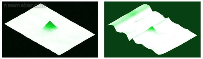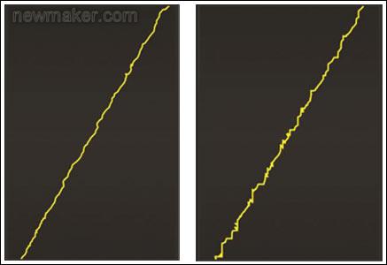 圖3. 一個(gè)機(jī)器臂握著4mm金屬片畫(huà)的直線(xiàn)。左側(cè)使用的是高SNR的觸摸屏控制器;右側(cè)使用的是低SNR觸摸屏控制器