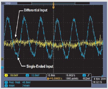 2、電荷放大器是一種非常敏感(高增益)的電路。圖17表明任何輸入干擾信號(hào)的電容耦合(此處為60Hz極板網(wǎng)柵)都會(huì)有效注入電流。就單端放大器而言,這意味著端子中的一個(gè)注入電流,而其他則接地;也就是說(shuō),放大器只會(huì)放大干擾信號(hào)。就差分輸入來(lái)說(shuō),施加于兩個(gè)端子的共模信號(hào)會(huì)相互抵消(假設(shè)寄生和反饋網(wǎng)絡(luò)相同)。圖18中,需要注意的是單端輸入(藍(lán)色軌跡)60Hz極板網(wǎng)柵的耦合結(jié)果,以及60Hz共模噪聲如何被干擾信號(hào)(黃色軌跡)相互抵消的差分輸入極大降低。本例中,為了方便理解,我們并沒(méi)有嘗試匹配超出10%組件容限的差動(dòng)輸入。