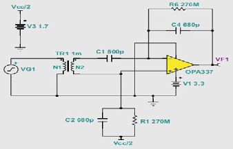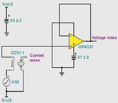為了獲得更為實(shí)際的電路實(shí)施,我們選用了TI的OPA337.這款放大器擁有低輸入電壓和低輸入電流噪聲(請(qǐng)參見(jiàn)圖5),同時(shí)接受3V單極電源。圖6顯示了TI SPICE型仿真程序中這種電路的模型,即TINA-TI.