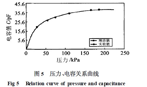 從表1 可見,擬合的電容誤差小于1 %。由此可見,在不同的時(shí)刻測得UO ( t) ,通過曲線擬合得出參數(shù)RC。再給電路加小信號直流電源,測出R 值,即求得C ,通過C 值則可知被測環(huán)境的壓力。圖5為350 ℃時(shí),不同的壓力所對應(yīng)的電容的理論值和實(shí)驗(yàn)值,從實(shí)驗(yàn)數(shù)據(jù)(表2) 可得,在測壓的過程中,利用模型識別的方法,誤差較小,其測壓誤差小于2 %。