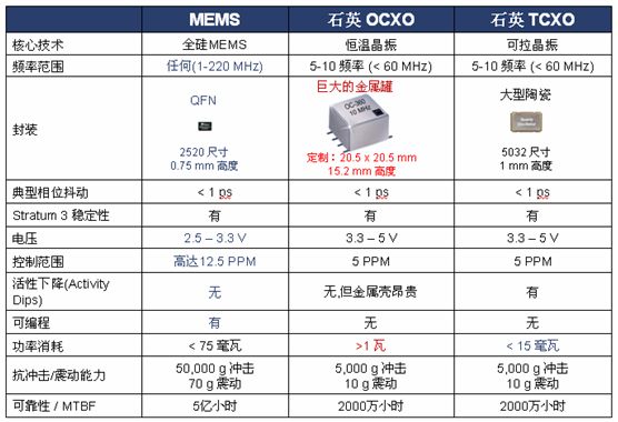 圖4:MEMS三級鐘和傳統(tǒng)OCXO和TCXO三級鐘的比較