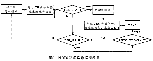 在現(xiàn)代無線通信中,數(shù)據(jù)都是以數(shù)據(jù)包的方式來進行傳輸?shù)?對NRF9E5這樣的無線片上系統(tǒng),每次發(fā)送和接收數(shù)據(jù)也是以數(shù)據(jù)包的方式進行的.數(shù)據(jù)包格式是通信協(xié)議的重要部分,NRF9E5的無線數(shù)據(jù)包格式有:Preamble、ADDR、PAYLOAD、CRC.其中,Preamble是前導碼,由硬件自動加上去;ADDR則發(fā)送32~40位地址碼;PAYLOAD是有效數(shù)據(jù)(最大為32bit);CRC是循環(huán)冗余碼校驗和,可以由內(nèi)置CRC糾檢錯硬件電路自動加上,可設為0位、8位或16位.傳感器節(jié)點最重要的工作就是將采集到的數(shù)據(jù)發(fā)送出去.要實現(xiàn)數(shù)據(jù)的無線發(fā)送,必須使處理器中的無線收發(fā)器工作在發(fā)送模式下.NRF9E5的收發(fā)器(NRF905)共有3種工作模式:ShockBurst接收(RX)方式、Shock Burst發(fā)送(TX)方式和節(jié)能方式,其發(fā)送數(shù)據(jù)流程如圖3所示.