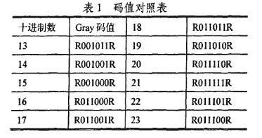 編碼采用格雷碼(Gray)為數(shù)值碼,以某一固定碼寬為參考碼R,它用于標(biāo)尺定位和提高精度。Gray碼是一種絕對編碼方式的無權(quán)碼,它所具有的循環(huán)、單步特性能消除隨機(jī)取數(shù)時(shí)出現(xiàn)重大誤差的可能,其任意兩個(gè)柏鄰整數(shù)之間轉(zhuǎn)換時(shí),只有一個(gè)位數(shù)發(fā)生變化,大大減少了由一個(gè)狀態(tài)轉(zhuǎn)到下一個(gè)狀態(tài)時(shí)的邏輯混淆,具有較強(qiáng)的容錯(cuò)能力。以6位編碼為例,其部分十進(jìn)制數(shù)與Gray碼的一一對應(yīng)關(guān)系如表1所示。
