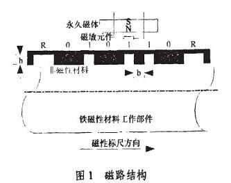 采用圖1所示的測量結(jié)構(gòu),其中被測工作部件要求屬于鐵磁性材料。文獻(xiàn)中指出在固定的磁場中,表面變化的曲率越大,引起的周圍磁場,變化也越大。為了使磁場的影響最大,選用凹槽作為測罩標(biāo)志,以單位寬度(bmm)的凹槽表示“0”或碼元間隔,單能寬度的“凸槽”表示“1”,兩倍單位寬度的“凸槽”表示標(biāo)志位R。在工作部件表面,按上述的編碼規(guī)則加下出一系列凹槽,然后噴涂上非磁性材料,形成磁性標(biāo)尺。圖1所示的磁性標(biāo)尺表示Gray碼01 1010碼區(qū),黑色部分表示非磁性材料。