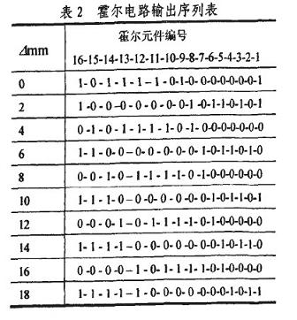 霍爾電路的工作原理是,在外磁場的作用下,當(dāng)磁感應(yīng)強(qiáng)度B超過導(dǎo)通工作點(diǎn)時(shí),霍爾電路輸出管導(dǎo)通,輸出低電-半:若曰值低于釋放點(diǎn)時(shí),輸出管截止,輸出高電半。因此在“凸槽”時(shí)鋼質(zhì)活塞桿被磁化,磁感應(yīng)強(qiáng)度曰增加,霍爾電路導(dǎo)通,輸出低電平,用“1”表示;在“凹槽”時(shí)輸出高電平,用“0”表示。以第1個(gè)霍爾元件為測量基準(zhǔn),從圖2所示時(shí)刻起,位移暈旃次變化b=2mm時(shí),一個(gè)碼區(qū)行程內(nèi)霍爾電路輸出的二進(jìn)制序列如表2所示。分析可知,序列的標(biāo)識碼為l 0000000 1,其前面或后面6位序列數(shù)分別為相鄰的兩個(gè)數(shù)值碼,這使它具有很強(qiáng)的容錯(cuò)能力。標(biāo)識碼每隔一個(gè)霍爾元件間距N在低位部分右移一位。值得注意的是,標(biāo)識碼前面的數(shù)值碼代表磁性標(biāo)尺當(dāng)前檢測位置下一個(gè)碼區(qū)的值。