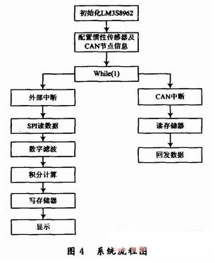 微控制器直接控制慣性傳感器的工作狀態(tài)并采集角速度、角加速度等信息,為了達(dá)到處理的實(shí)時(shí)性,當(dāng)ADIS16365有數(shù)據(jù)需要發(fā)送時(shí),中斷通知微控制器進(jìn)行讀取。微控制器將采集到的數(shù)據(jù)進(jìn)行積分及濾波處理,并將處理后的信息存儲在片內(nèi)FLASH中。當(dāng)微控制器接收到數(shù)據(jù)請求時(shí),通過CAN總線發(fā)送數(shù)據(jù)。圖4為系統(tǒng)主流程圖?! ?/p>