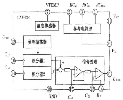 CAV424是專門用于電容檢測轉換的集成芯片, 其工作原理圖及外圍連接圖如圖1所示。