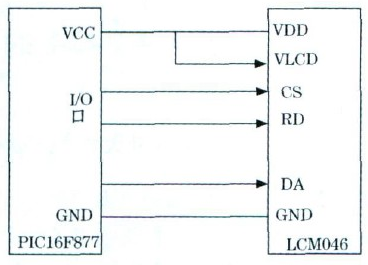 控制顯示電路以單片機為核心, 選用PIC16F877單片機為控制器, 其內部含有10位高精度A /D轉化器, 能夠直接處理模擬電壓, 調整CAV424的GLP , 可以使輸出電壓范圍在2 5~ 35V 之間, 滿足單片處理信號的要求。顯示器件選用LCM 046液晶模塊, 其功耗低, 工作電流只有μA級, 并且其與處理器連接簡單。連接圖如圖4所示。